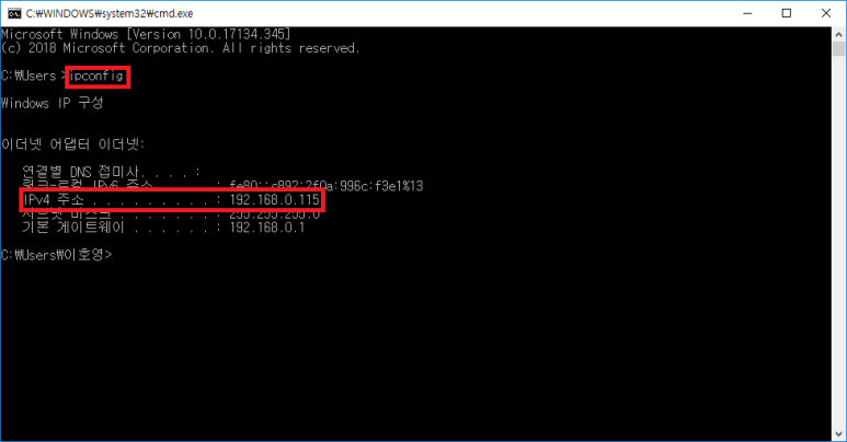 ▶ ipconfig 입력 후 엔터를 입력합니다.
