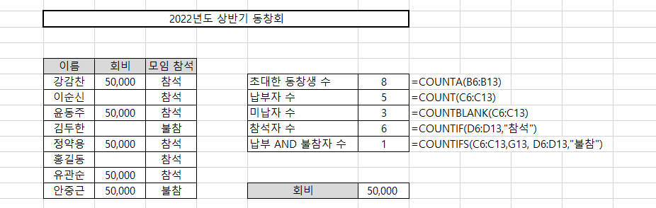 회비는 숫자이기 때문에 COUNT함수를 사용하여 회비셀을 영역으로 지정하고 회비를 납부한 사람의 수를 구하면 됩니다.