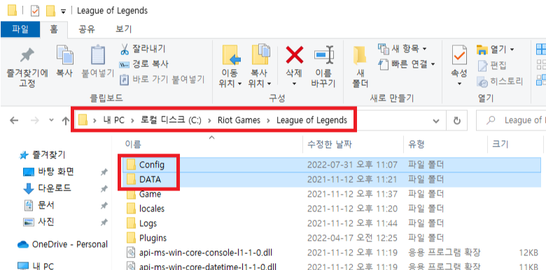 그 후 [C:\Riot Games\League of Legends] 해당 경로의 DATA, Config 폴더를 삭제 해주시면 됩니다.