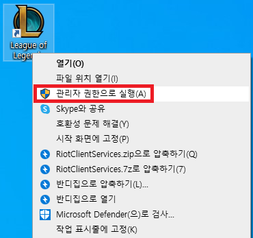 리그 오브 레전드 게임을 관리자 권한으로 실행하면 해결되는 경우도 있습니다.