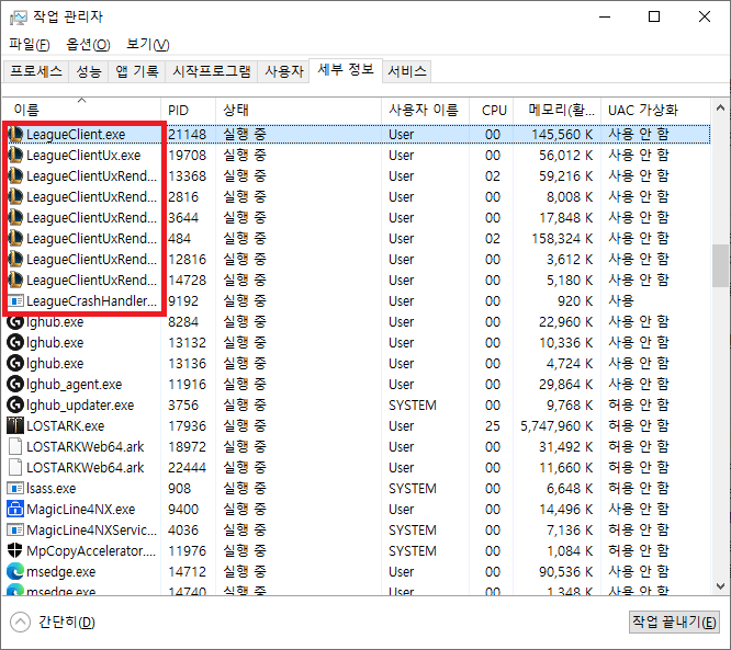 이 문제는 작업관리자에서 리그 오브 레전드와 관련된 작업을 모두 종료한 후 다시 실행하시면 됩니다.