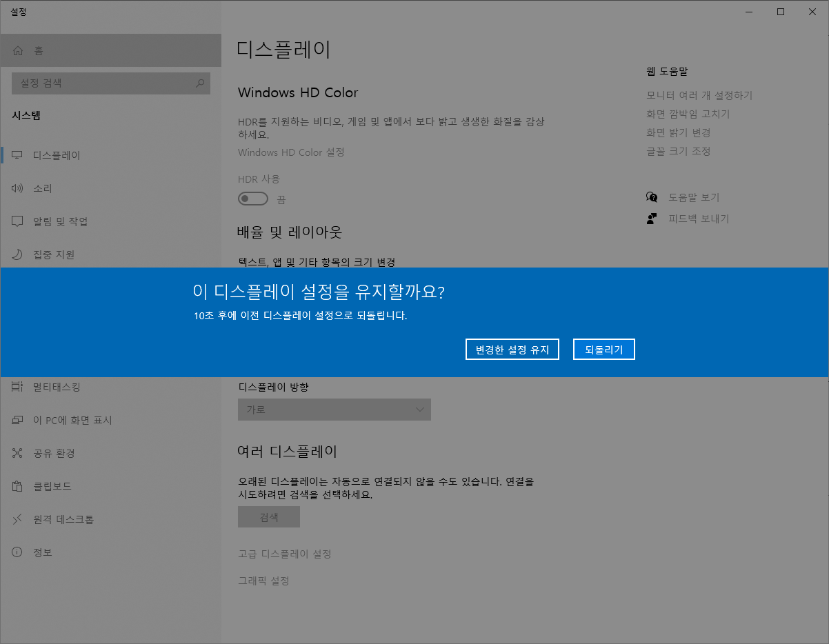 해당 해상도가 맘에 들지 않다면 "되돌리기" 를 선택하시면 됩니다.
