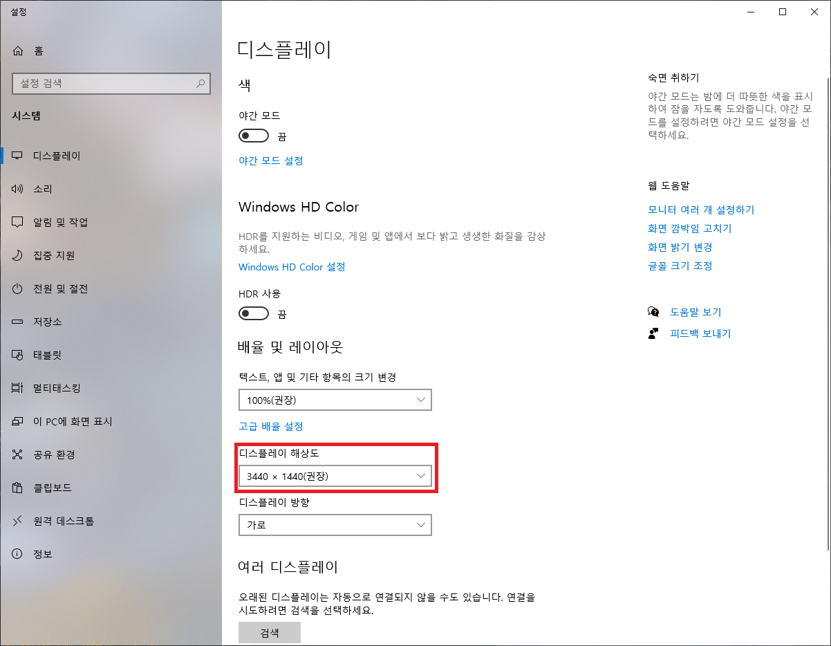 ▶  아래 화면처럼 "디스플레이 해상도" 아래 부분의 박스를 클릭합니다.