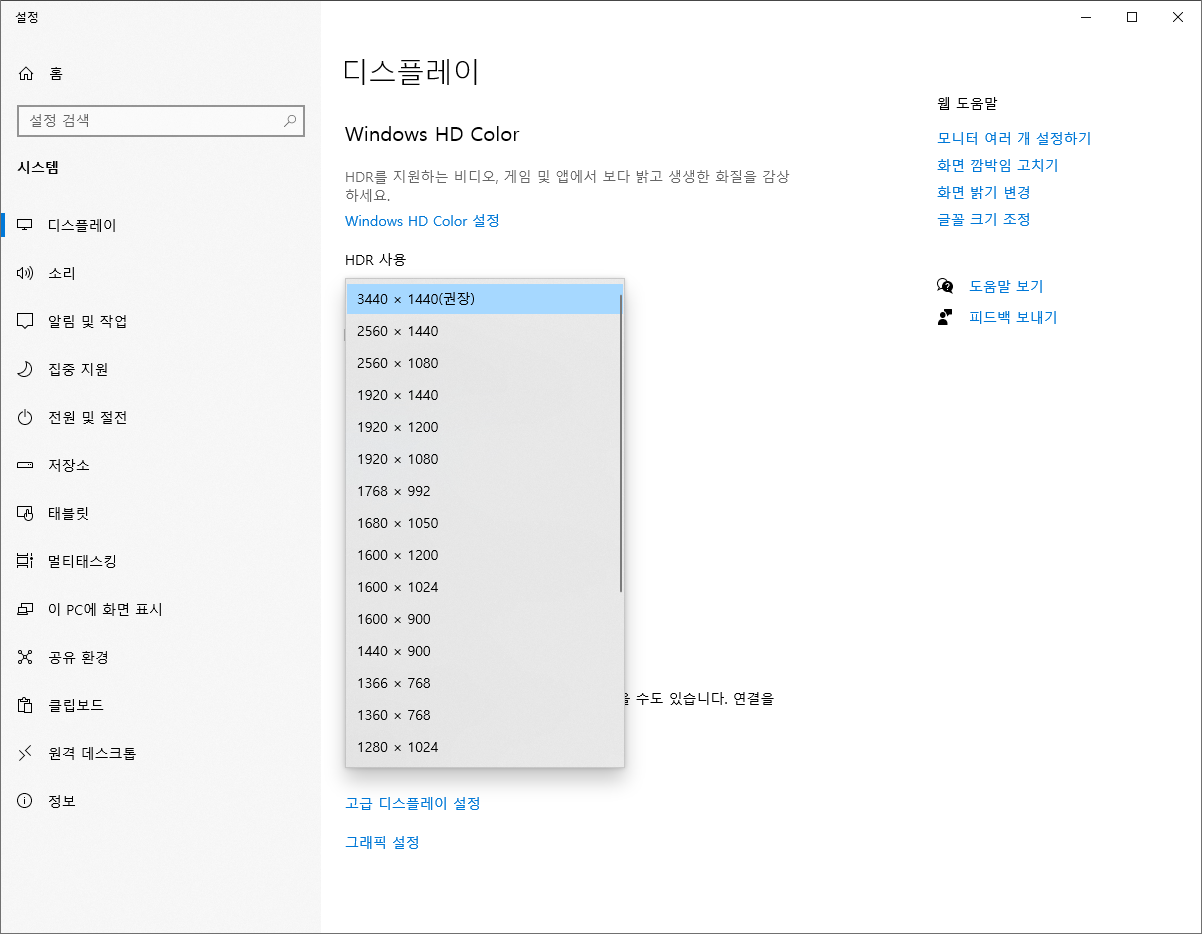 보통 초기 세팅은 그래픽 카드와 모니터가 지원하는 최대의 해상도로 설정되어 있습니다.