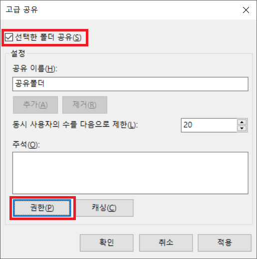 3. [선택한 폴더 공유(S)] 체크박스를 체크한 뒤 "권한(P)" 버튼을 클릭합니다.