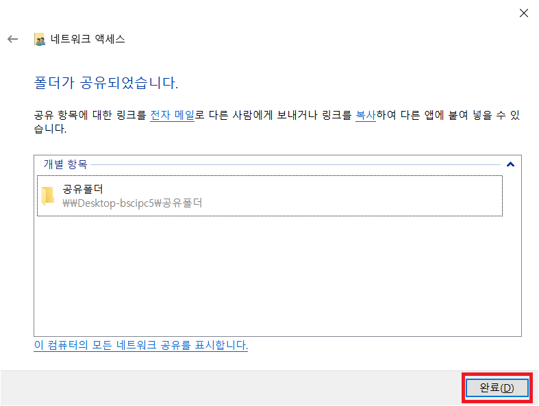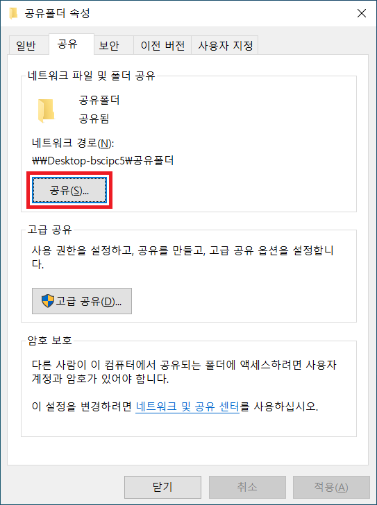 ※ 공유폴더 아래에 보이는 [ \\Desktop-bscipc5\공유폴더 ]가 공유폴더 접속 경로입니다.