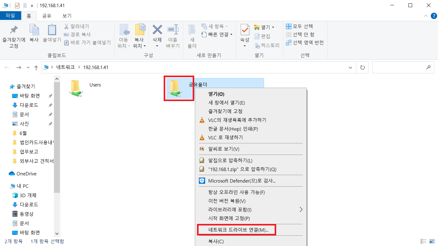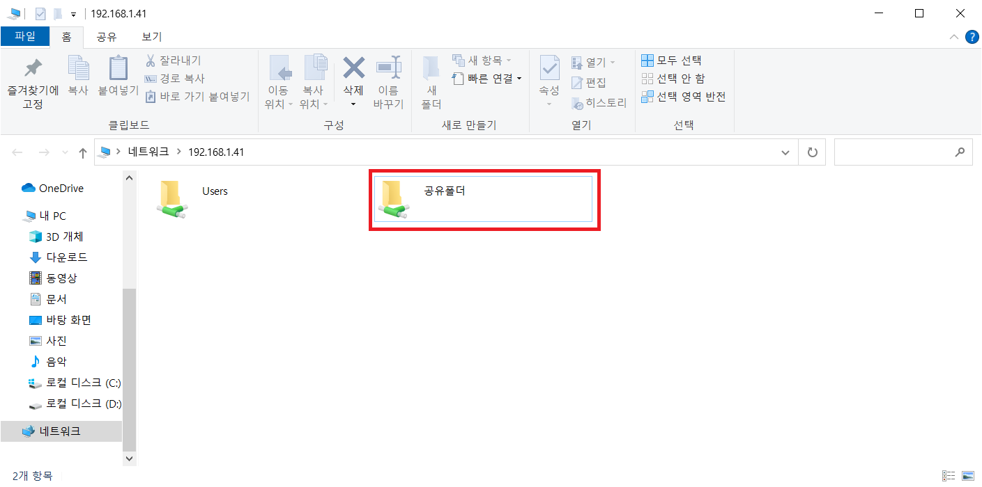 공유폴더가 만들어져 있는 컴퓨터의 IP를 이용한 접속경로는 [ \\192.168.1.41 ]입니다.