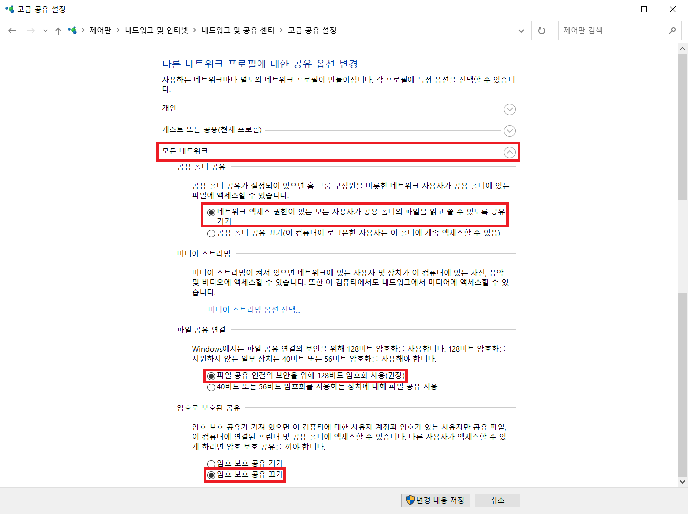 공유폴더 네트워크 옵션 설정