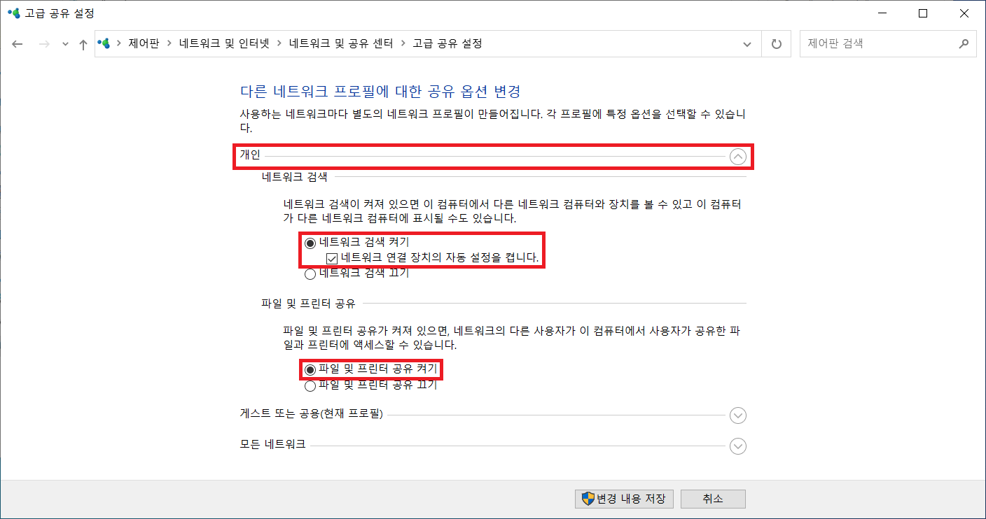 5. 고급 공유 설정에서 첫 번째로 [게스트 또는 공용(현재 프로필)] 탭 옵션을 아래와 같이 설정합니다.