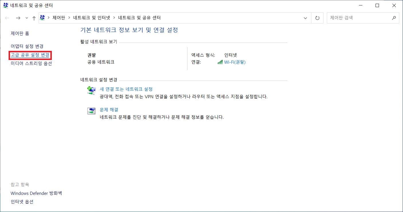 4. 네트워크 및 공유 센터 창에서 [고급 공유 설정 변경]을 클릭합니다.