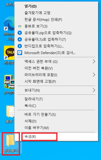 1. 공유폴더로 설정할 폴더를 마우스 오른쪽 버튼으로 클릭하여 "속성(R)"을 선택합니다.