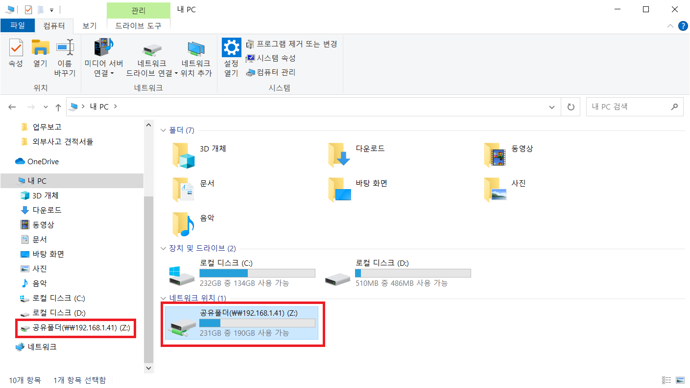 - 공유폴더 사용 시 메인 컴퓨터(공유폴더를 만든 컴퓨터)는 켜져 있는 상태여야 합니다.