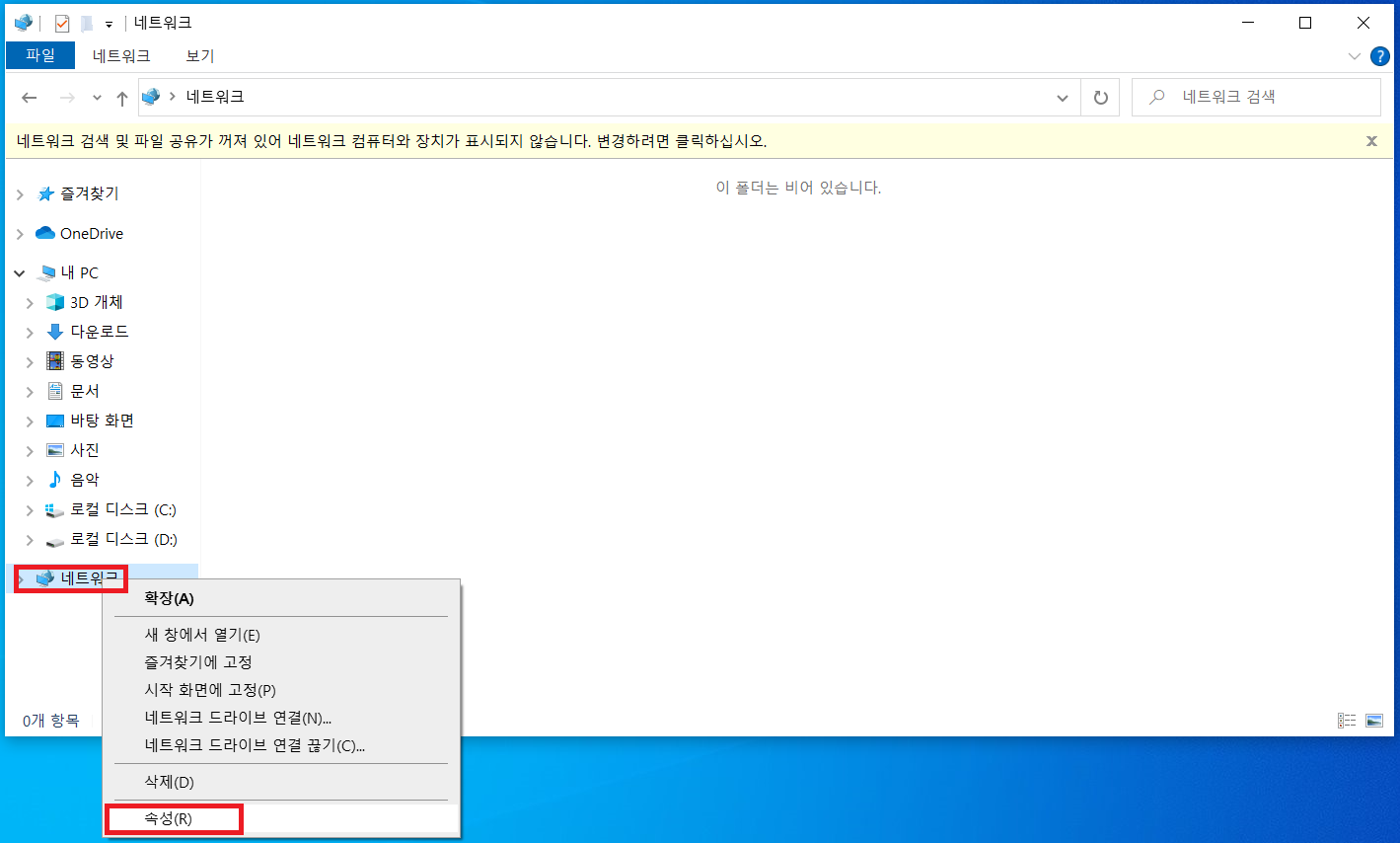 3. 이번에는 네트워크를 마우스 오른쪽 버튼으로 클릭하여 "속성(R)"을 선택합니다.