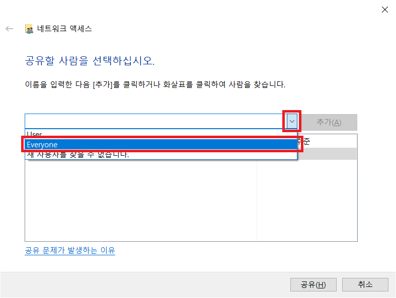 6. "V" 버튼을 클릭하여 "Everyone"을 선택하고 "추가(A)" 버튼을 클릭합니다.