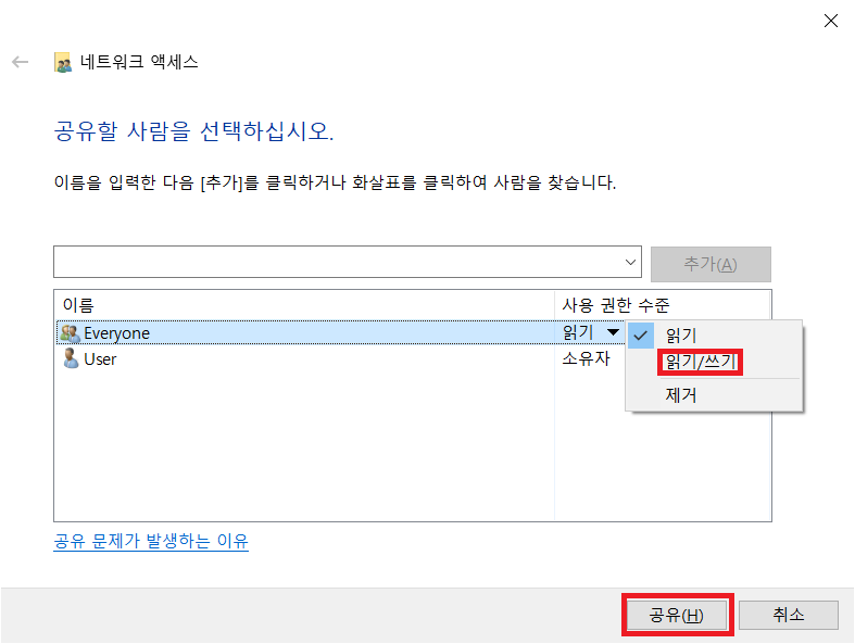 7. 추가된 Everyone의 권한을 [읽기/쓰기]로 변경하고 "공유(H)" 버튼을 클릭합니다.