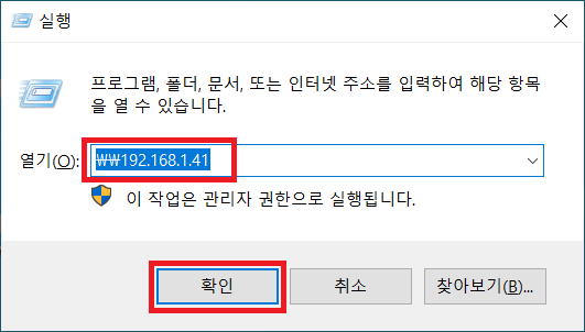 1. 실행창(단축키 : 윈도우키 + R)에 공유폴더의 접속경로를 입력 후 확인 버튼을 클릭합니다.