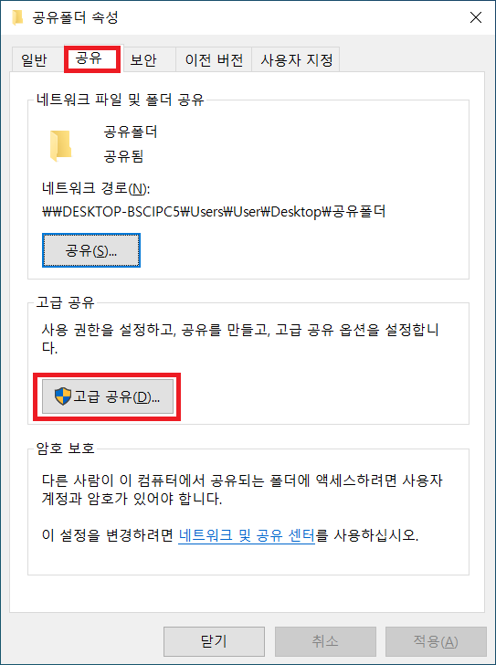 ※ 공유폴더 아래에 보이는 [ \\Desktop-bscipc5\공유폴더 ]가 공유폴더 접속 경로입니다.