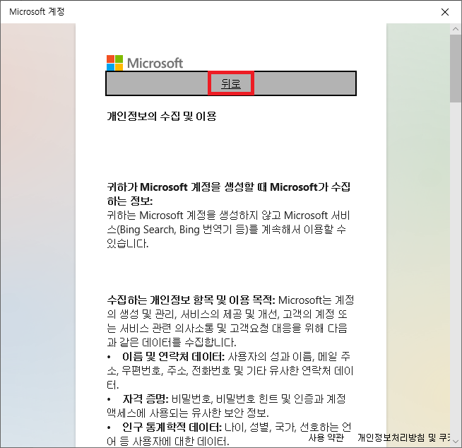 ▶ 약관에 동의를 위하여 "자세히"를 클릭하여 약관을 읽어보신 후 "뒤로" 버튼을 클릭하여 2개의 약관에 모두 체크를 하신 뒤 "동의" 버튼을 클릭합니다.