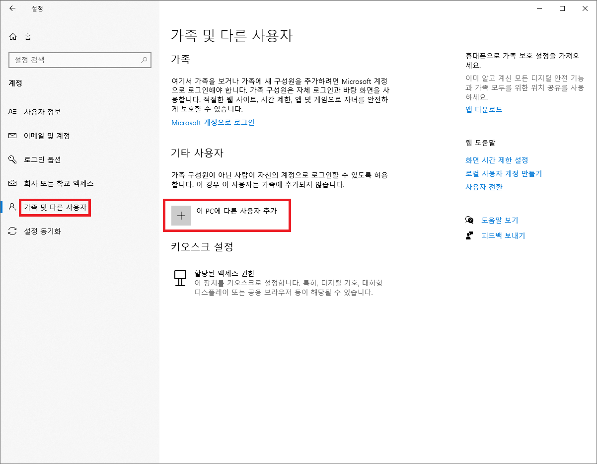 ▶ 왼쪽 사이드에 있는 메뉴들 중 "가족 및 다른 사용자"를 클릭합니다.