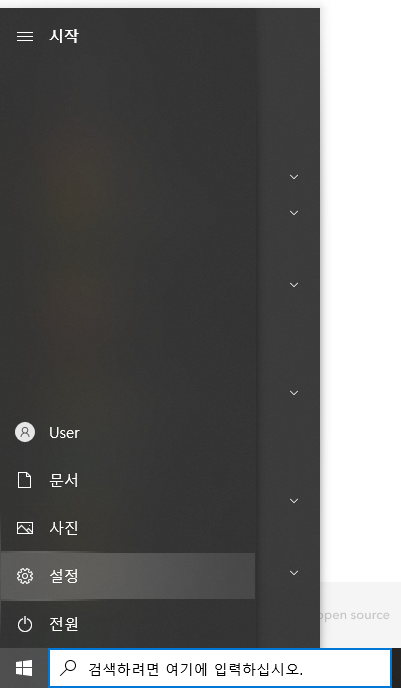 ▶ 윈도우 시작 아이콘을 누른 후 "톱니바퀴 모양(설정)"을 선택합니다.