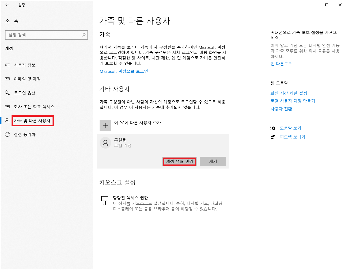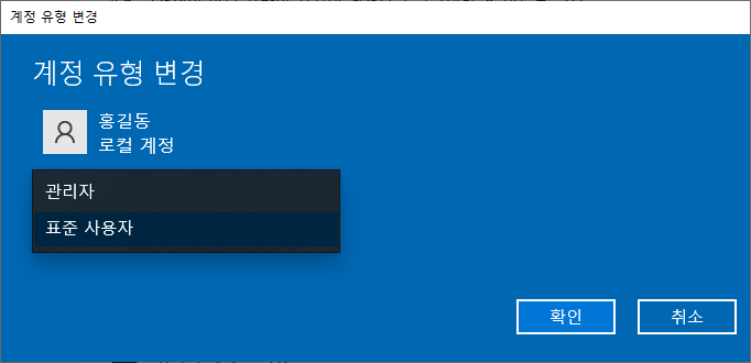 저는 홍길동 계정을 표준 사용자에서 관리자로 변경하였습니다.