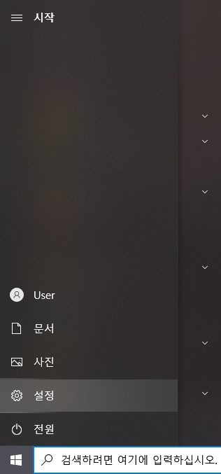 ▶ '시작' 메뉴에서 '톱니바퀴 모양 아이콘(설정)' 찾아 클릭합니다.