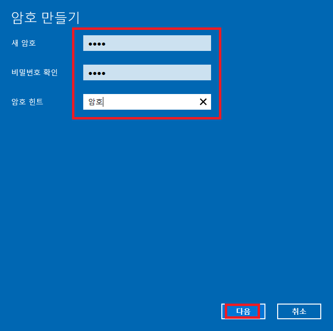 ▶ "새 암호", "비밀번호 확인", "암호 힌트" 모두 작성하신 후 "다음" 버튼을 클릭합니다.