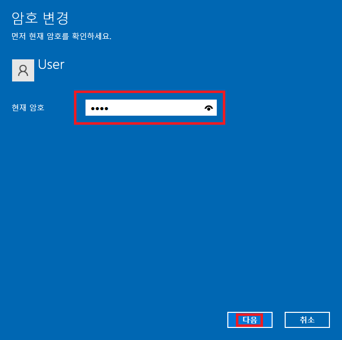 ▶ 현재 사용 중인 암호를 입력하신 후 "다음" 버튼을 클릭합니다.