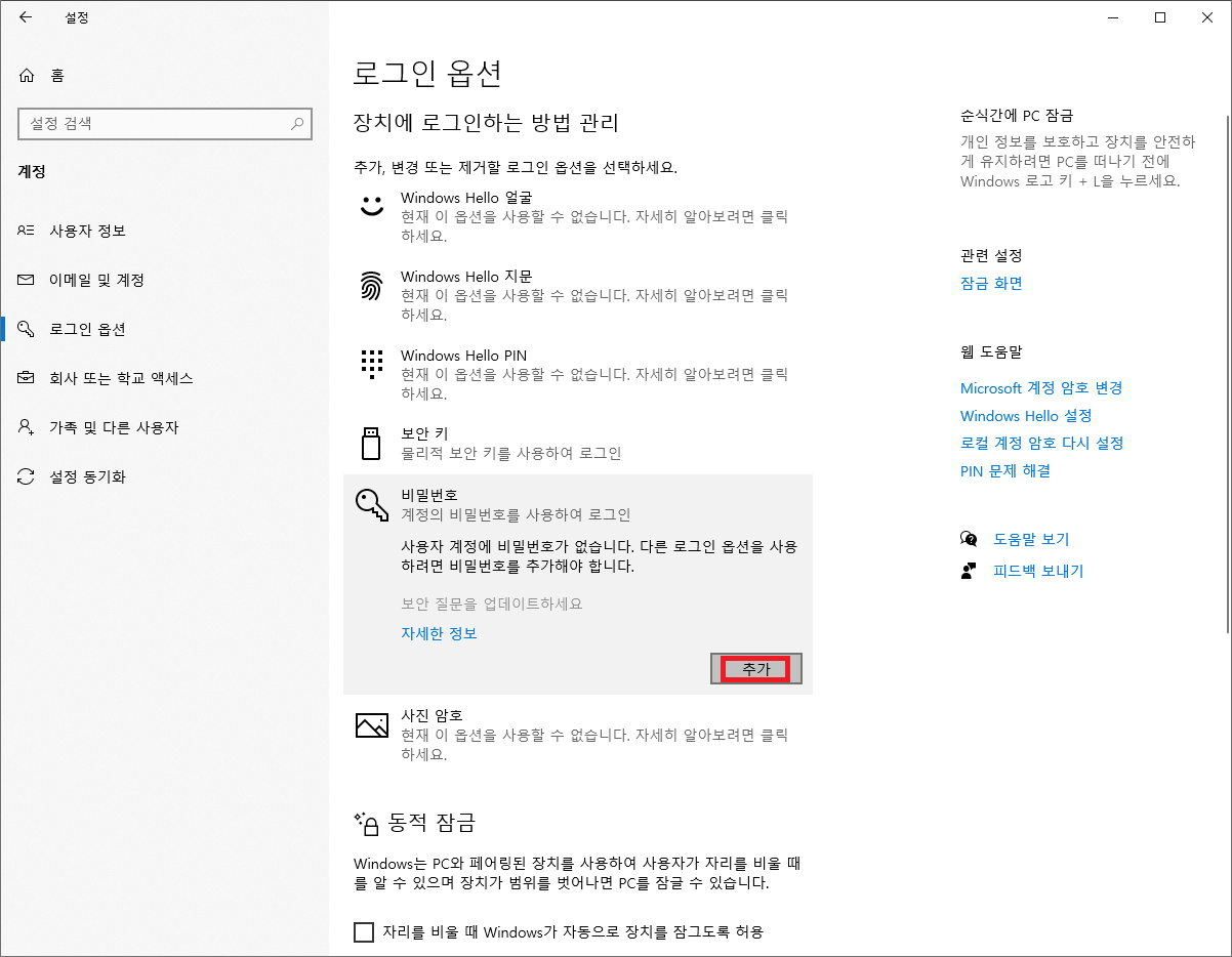 생성과 같은 방법으로 "로그인 옵션 > 비밀번호"까지 따라 하신 후 "변경"으로 바뀐 버튼을 클릭합니다.