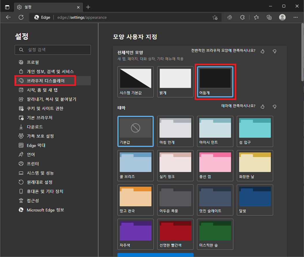 2. 왼쪽 [브라우저 디스플레이] 섹션을 선택 후 "전체적인 모양 > 어둡게"를 설정해 줍니다.