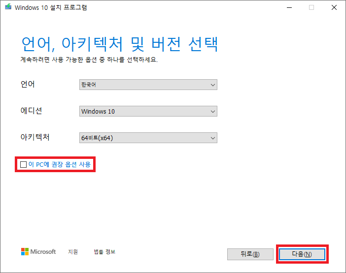 ※ 따로 원하시는 설정이 없다면 "이 PC에 권장 옵션 사용" 이 체크된 상태로 "다음(N)" 버튼을 클릭하셔도 무방합니다.
