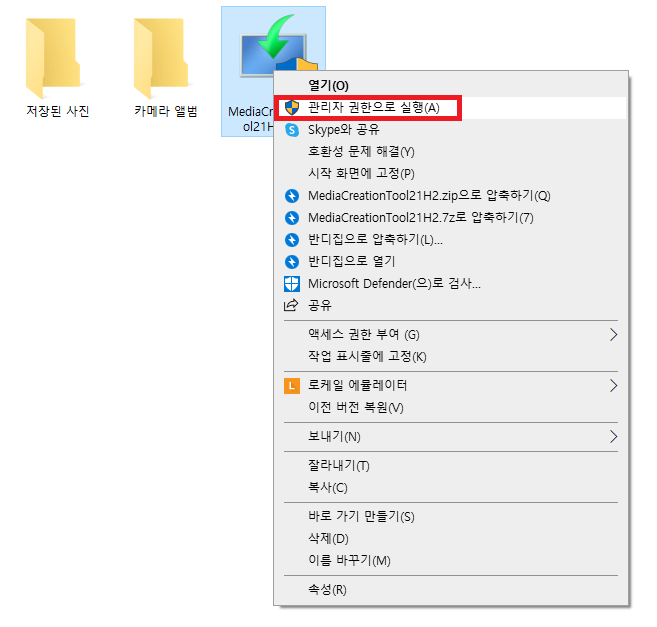 1. 다운로드한 "MediaCreationTool21H2.exe" 파일을 마우스 오른쪽클릭하고