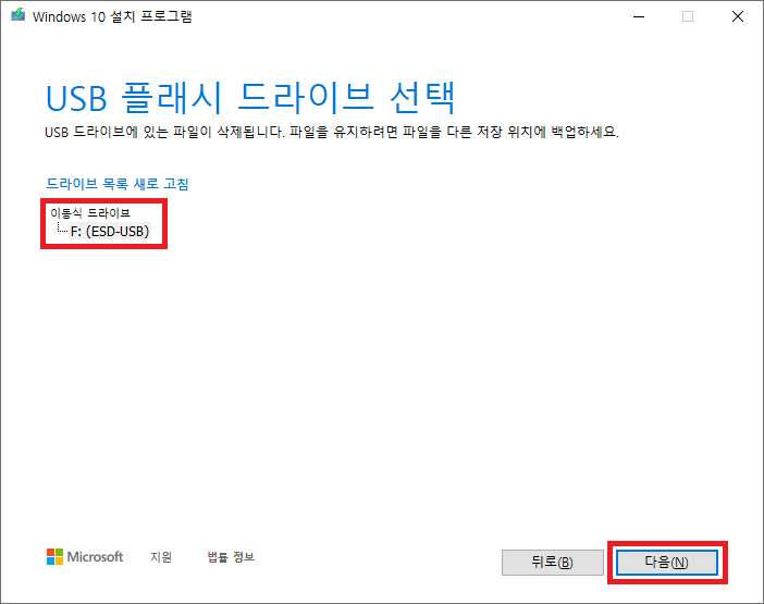 "윈도우10 설치 USB를 만들려는 이동식 드라이브"를 선택 후 "다음(N)" 버튼을 클릭합니다.
