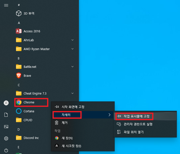 번외 3. 크롬을 마우스 오른쪽 클릭 후 "작업 표시줄에 고정"을 선택합니다.