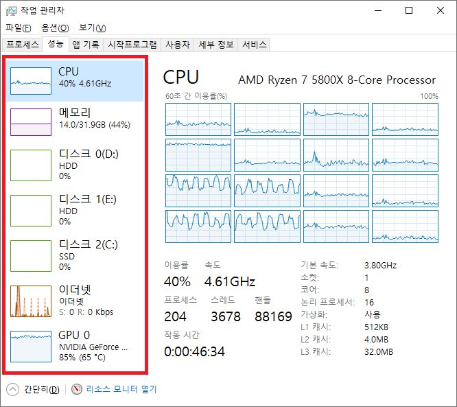 ▶ 왼쪽 항목들을 클릭하여 원하는 부분의 성능을 확인하실수 있습니다.