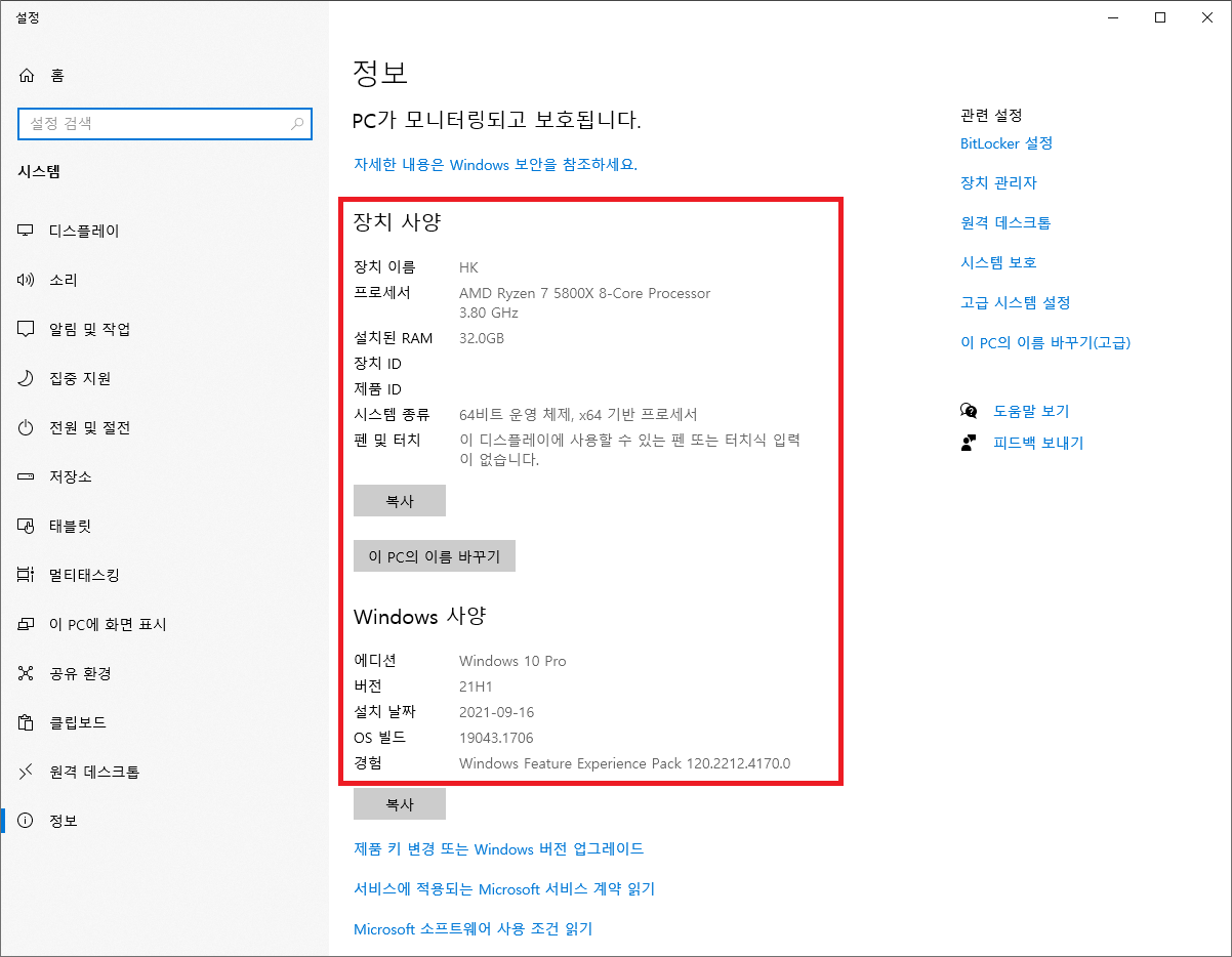 ▶ "장치 사양" 과 "Windows 사양" 이 출력 됩니다.