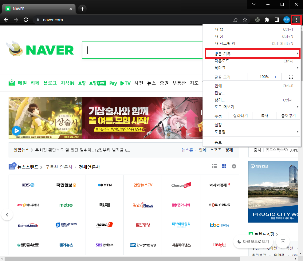 크롬의 경우에는 오른쪽 상단의 [···] 버튼을 클릭 후 [방문 기록]을 선택하여 내가 접속했던 웹페이지들을 다시 열어보실 수 있습니다.