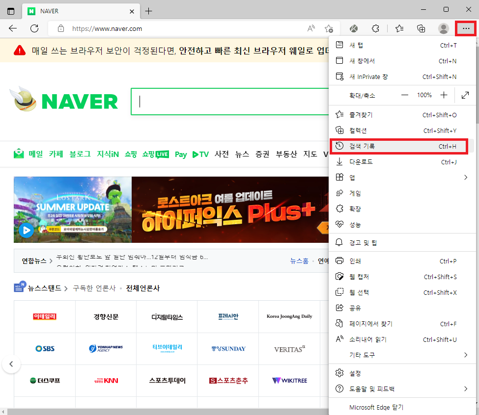 번외로 엣지와 크롬 두 브라우저 모두 [ Ctrl + H ] 단축키로 사용기록을 확인하실 수 있습니다.