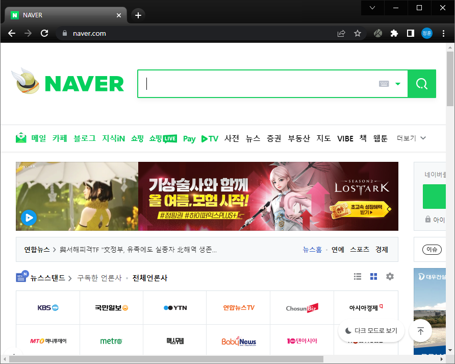 2. 인터넷 브라우저 상단의 탭이 열려있지 않은 아무 곳이나 마우스 오른쪽 버튼을 클릭합니다.