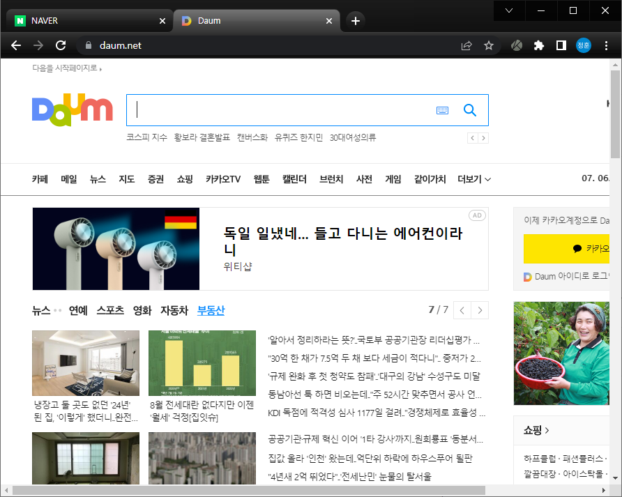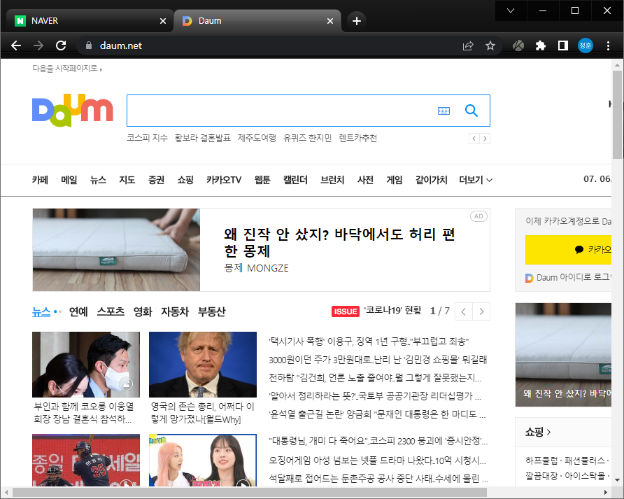 먼저 아래 그림과 같이 네이버와 다음 두 개의 탭이 켜져 있는 상황이었다는 가정하에 알려드리겠습니다.