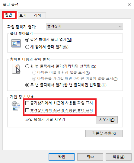 2. 폴더 옵션 창 중 [일반] 탭을 선택합니다. 일반 탭의 하단에 [개인 정보 보호] 섹션에 있는 "즐겨찾기에서 최근 사용된 파일 표시", "즐겨찾기에서 최근에 사용된 폴더 표시" 두 개의 체크를 해제해 줍니다.