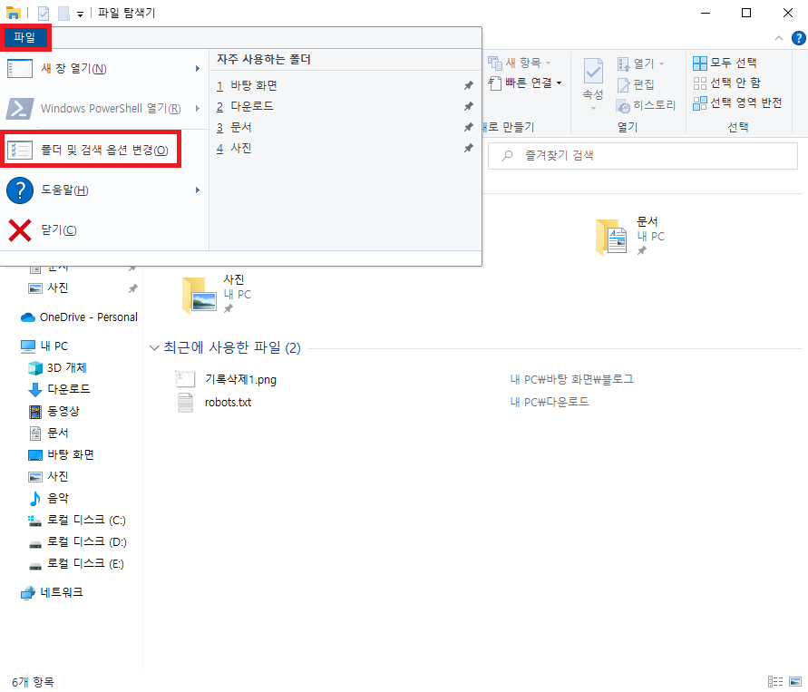 1. 왼쪽 상단의 [파일]을 클릭 후 [폴더 및 검색 옵션 변경(O)] 버튼을 선택합니다.