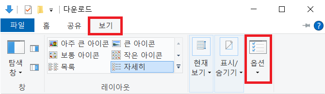 2. 탐색기 상단의 [보기] 탭을 선택 후 [옵션] 메뉴를 클릭합니다.