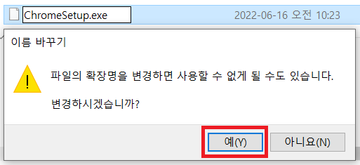 3. 확장자를 변경하게 되면 아래와 같은 문구가 나오게 되는데 [예(Y)] 버튼을 눌러줍니다.
