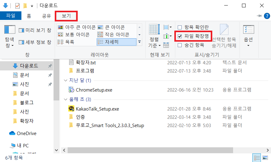 번외) 더 간단한 방법으로는 탐색기의 [보기] > [표시/숨기기] 그룹의 [파일 확장명] 옵션을 체크 OR 체크해제하여 설정할 수 있습니다.