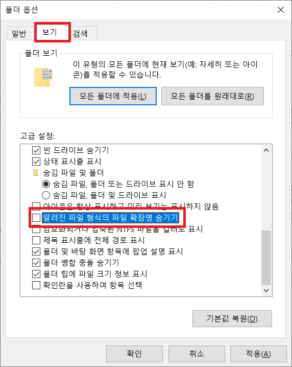 ※ 옵션이 체크되어 있으면 확장자 표시, 체크해제 되어 있으면 확장자 숨김 입니다.