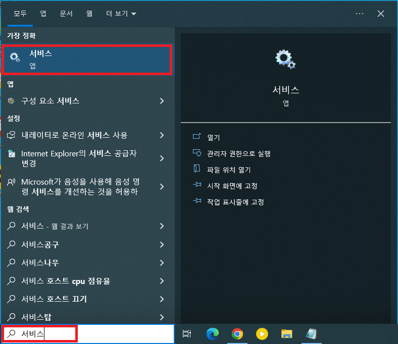 1. 오른쪽 하단의 검색창에 "서비스" 를 검색하여 앱을 실행합니다.