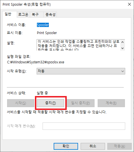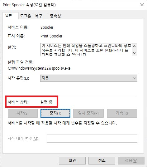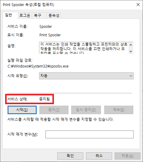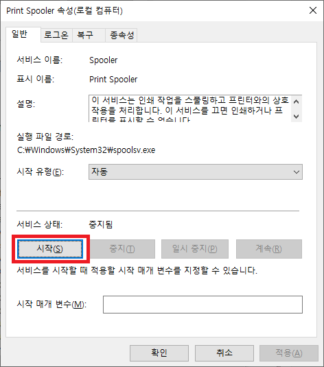 5. 아래와 같이 시작 버튼이 활성화되고 서비스 상태가 중지됨으로 표시되어야 합니다.