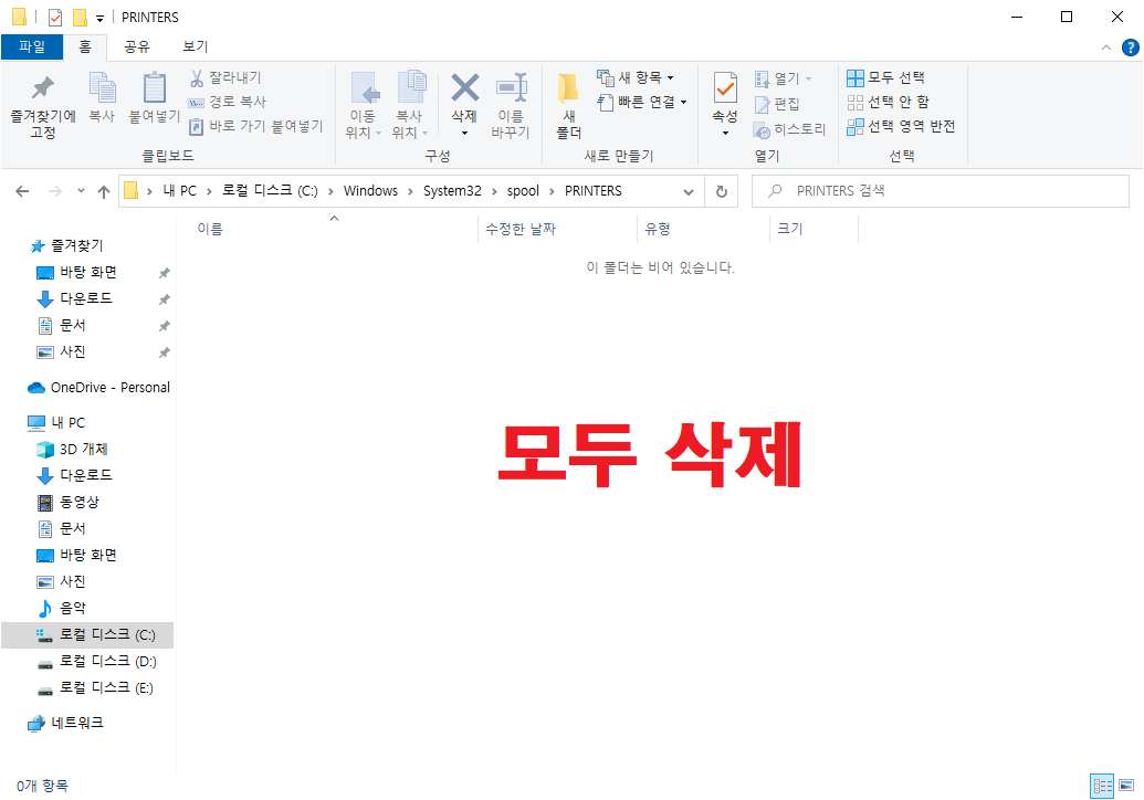 7. PRINTERS 폴더 내의 모든 파일을 삭제 해줍니다.