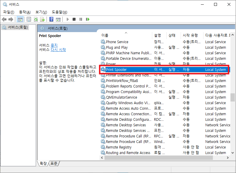 2. 서비스 목록 중에서 "Print Spooler" 라는 서비스를 찾아 더블클릭 합니다.